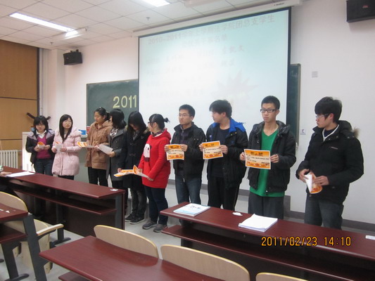 团总支副书记王怡然同学总结了上年度新葡萄官网团学工作所取得的各项成就,对所有团学干部的努力予以肯定并表达真挚谢意,随后,荣获2010-2011年度团学优秀干事称号的10位同学在高昂的背景音乐声中上台领奖台并合影留念。