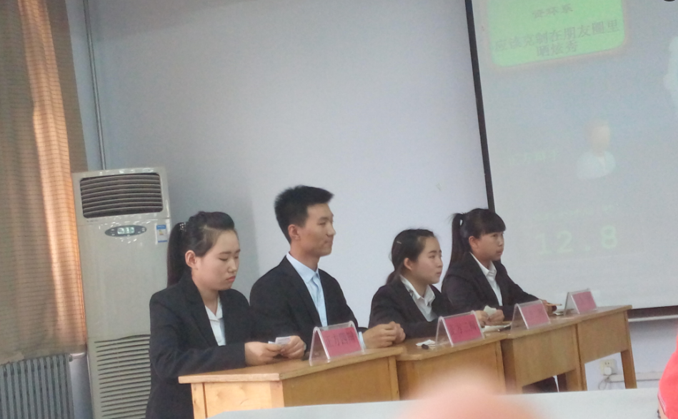 6月1日下午一点三十分,资源与环境系和数学与计算机系进行了第三四名的争夺。思想政治理论课教学科研部主任赵云耕老师,美术系党总支副书记张瑞红老师以及政法系王更老师出任评委老师。本次决赛的标题为该不该克制在朋友圈里晒炫秀,而我方观点为应该克制在朋友圈里晒炫秀。