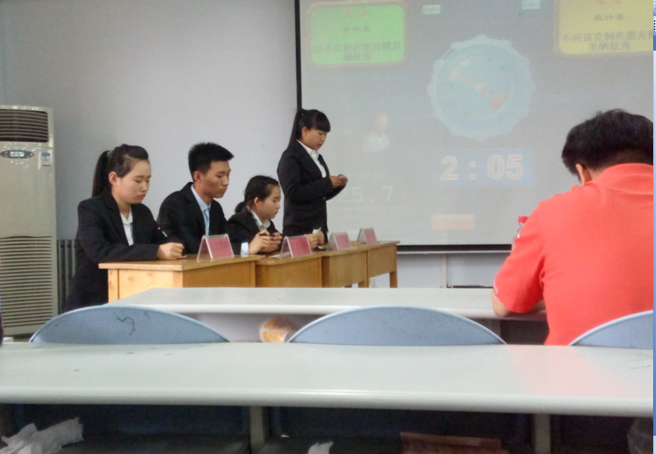在比赛开始后,可以看出同学们都做了充分的准备,并都能遵守比赛规则。正反方一辩的陈述迅速点燃全场温度,整个比赛过程中同学们积极提问,踊跃发言。比赛也异常激烈,尤其是自由辩论环节,双方更是紧紧抓住对方的问题和不足紧追猛打,火花四溅,掌声更是此起彼伏。我方在最后比对方多了半分钟左右的时间,四位辩手更是连连提问,步步紧逼,打的对方辩友措手不及。终于随着我方四辩的陈词完毕,此次辩论赛也随之落幕。经评委的商议后我方荣幸胜出,同时也夺得了本次辩论赛的季军。