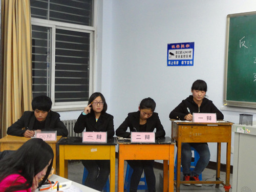 比赛刚开始,双方辩友就以各自新颖,诙谐的言语动作做出精彩的自我介绍,从而赢来了整个赛场的一波高潮。在接下来的三个环节中,双方都备战充实,你来我往,各不相让,各自围绕着自己的观点进行阐述。最精彩的阶段应该是自由辩论阶段了。比赛气氛异常激烈,双方辩友针锋相对,唇枪舌战,却又不失风度,侃侃而淡。现场的拉拉队更是热情饱满,都争着为自己的专业呐喊助威,向对方辩友提问各种尖锐问题。最后三对正当反方经过两个多小时候激烈辩论,比赛最终结束。经过认真的筛选和选拔谷晨超、司玮、安晨宇、范云波、张婧希、李可新、李美璐、张向前、王志宁、孙瑞、赵旭、张雨菲等同学成功入选辩论组。