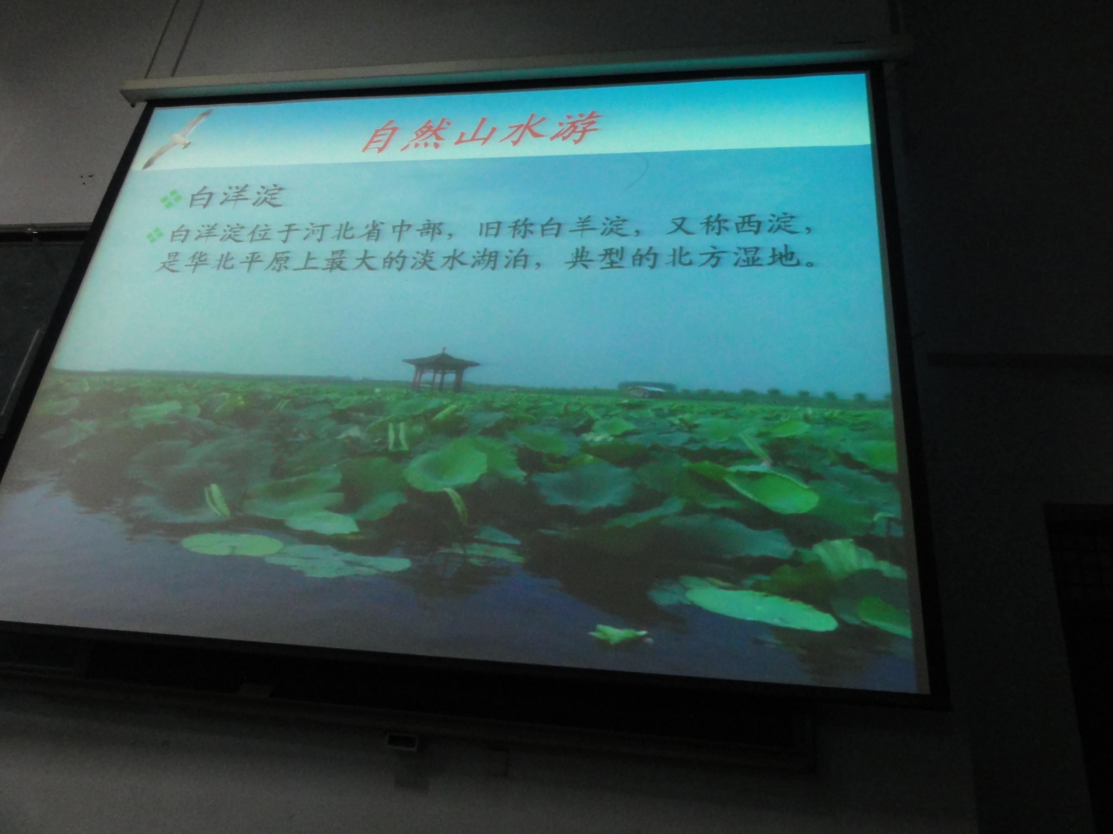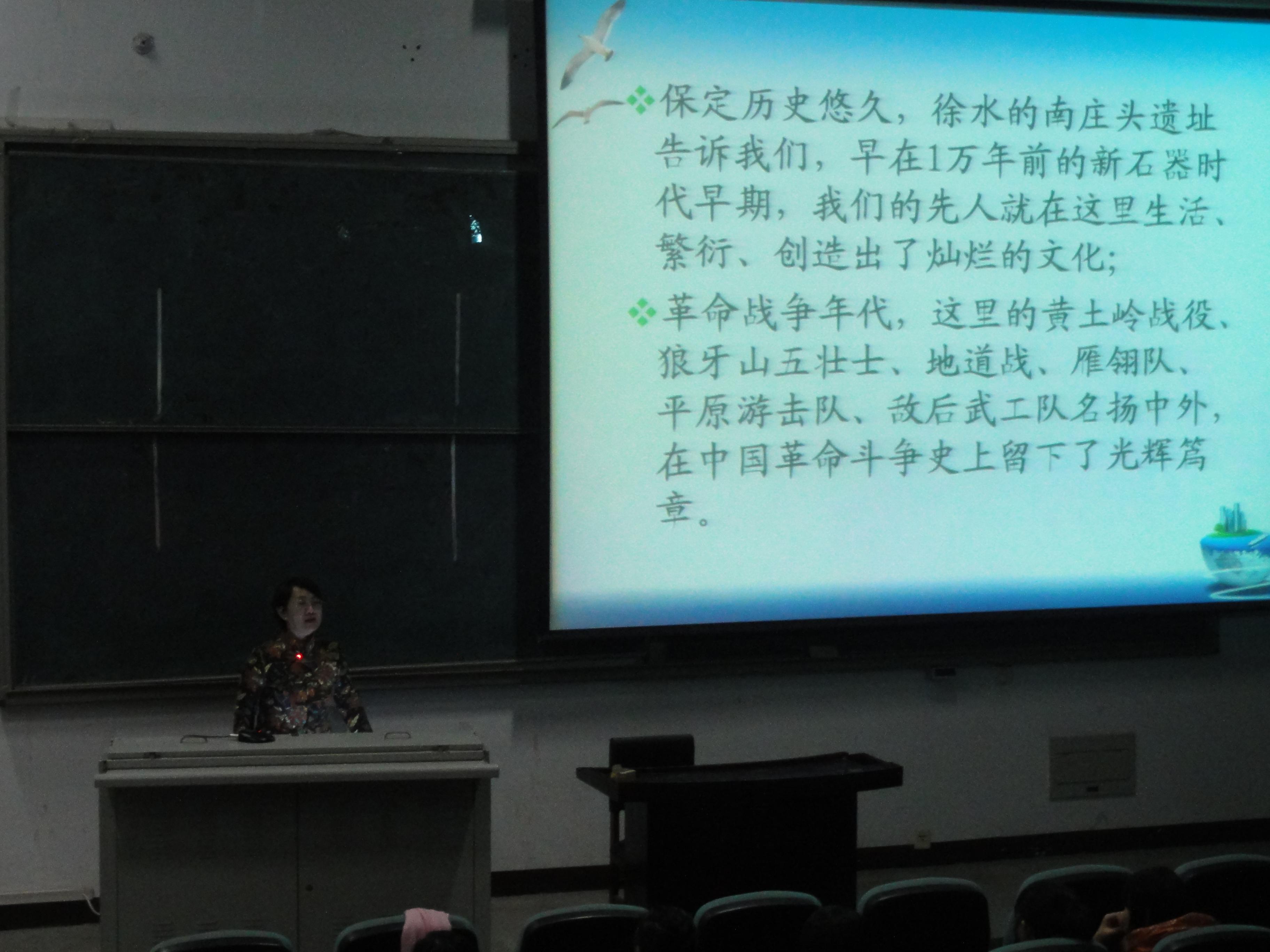 资源与环境系伍晓晴老师于12月9日在D-105举行了关于保定市旅游资源的讲座。伍老师讲座时落落大方,幽默风趣,深深的吸引了所有在场的听众,老师丰富的知识也让同学们深深地折服。