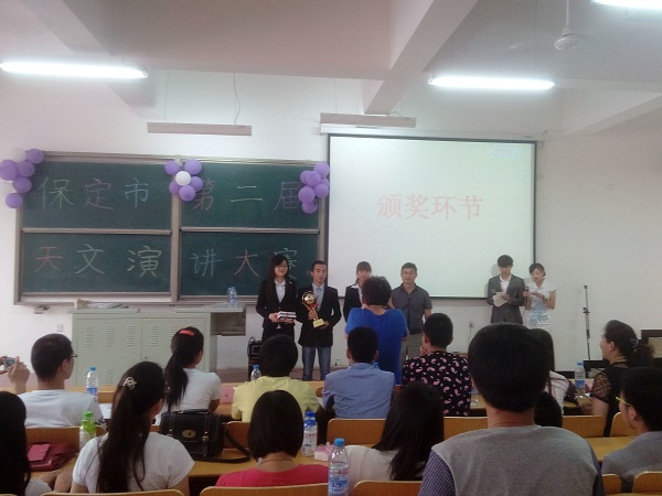 赛中,参赛选手以丰富的知识,多彩的节目,有趣的互动,充分展示了青春的朝气和活力、学识与智慧,全场高潮迭起,精彩不断。在我校王克柱老师的指导下和廉海明老师的鼓励下,我们保定学院的三位选手位梦姣,郭庆,陈帅革参加比赛,三位选手经过充分的准备表现的特别出色,以娴熟的演讲技能,精彩的演讲内容获得大家的肯定,最终夺取桂冠。随着颁奖仪式的举行,选手们与评委合影留念,保定市第二届大学生天文演讲大赛精彩落幕。在场大学生们沉浸其中,意犹未尽。