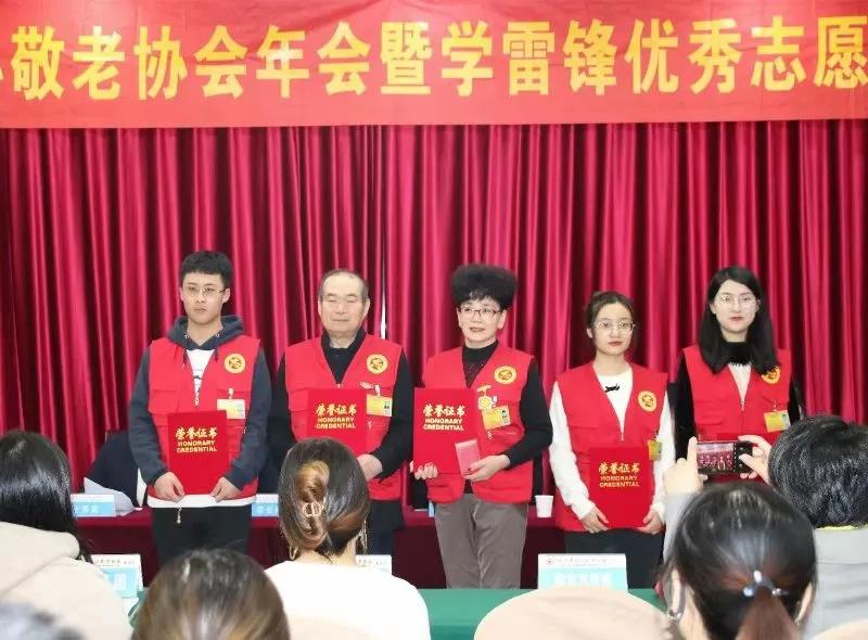 年会结束后,保定学院的四位同学帮忙把志愿马甲回收并和爱心敬老协会会长张平合影。