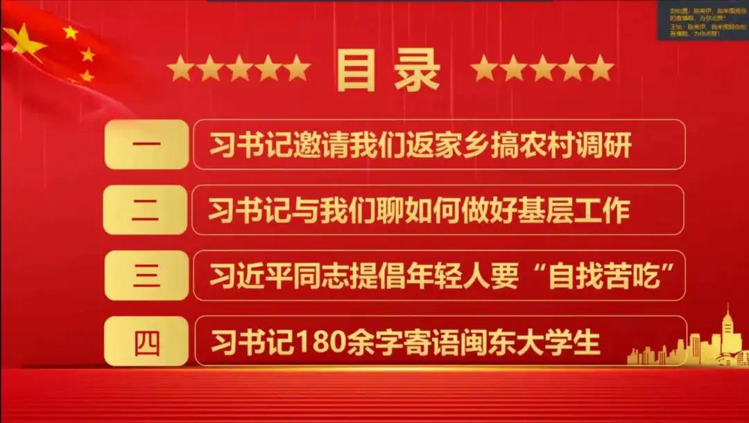 首先,此次分享书本目录为前四篇,第一篇为习近平总书记邀请我们返家乡搞农村调研,主讲人提到了书中对曹兵海教授的采访及教授对习近平总书记话语的感受。第二篇为习近平总书记与我们聊如何做好基层工作,主讲人提到了书中对徐南雄副书记的采访及他在笔记中的记录。第三篇为习近平总书记提倡年轻人要“自找苦吃”,主讲人提到了书中对张宏樑副书记的采访,这一部分主讲人连麦团总支组织部部员朱家良,他分享了自己对习近平总书记话语的感受,在这期间团总支成员通过评论分享自己的感受,激励自己和青年大学生积极学习了解习近平总书记勤俭持家、艰苦奋斗、不忘初心、砥砺自我的精神。第四篇为习近平总书记180余字寄语闽东大学生。主讲人提到了书中对郭海鹰副会长的采访,习近平总书记记寄语闽东大学生希望他们珍惜美好时光,安心学习,学有所成,早日参加建设,造福桑梓,为社会主义祖国的繁荣昌盛做出应有的贡献!
