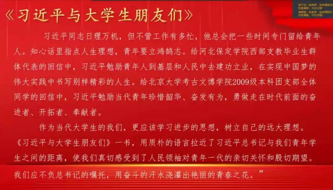 此次直播主讲人为团总支组织部部长陈美伊。主讲人给我们介绍了这本书的前言:它是一本由中国青年出版社出版的书籍,以访谈实录的形式讲述了1983年12月至2017年7月间,习近平总书记在河北正定、福建、浙江、上海和到中央工作以来与大学生们交往交流交心的故事,真实记录了他对青年,特别是大学生始终如一的关注关心关爱。这本书用质朴的语言拉近了习近平总书记与我们青年学生之间的距离,使我们真切感受到了人民领袖对青年一代的亲切关怀和殷切期望。主讲人提到我们青年应不负习近平总书记的嘱托,用奋斗的汗水浇灌艳丽的青春之花。