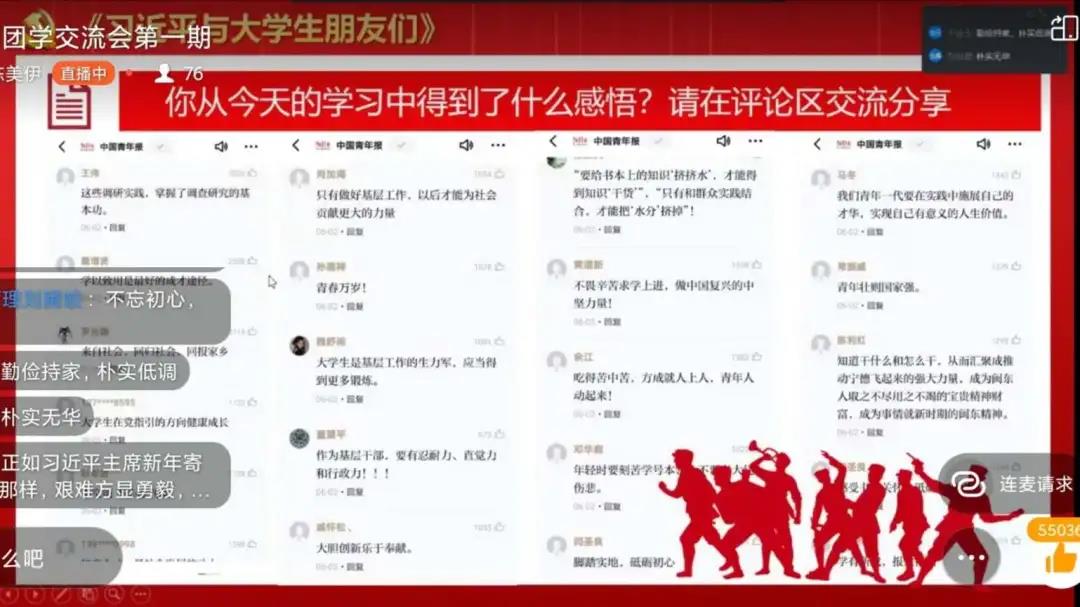 最后,主讲人和团总支、学生会所有成员一起分享感悟,团总支组织部李金垚连麦发表自己的感悟,他提到了在疫情中习近平总书记对人民的关怀,重视人民,从人民的角度出发。许多同学也在评论区纷纷打下自己见解与领悟,积极的交流分享不同的感悟。