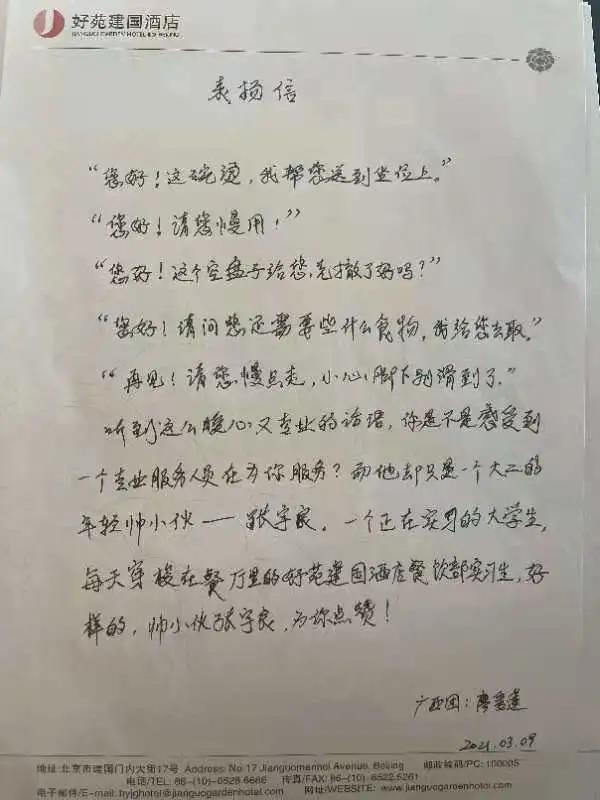 在服务期间,我校学生用耐心周到的服务打动了人大代表,一句句真诚的话语,温暖着人心。对此广西人大代表特留信表扬我校学生:张宇良,在两会服务期间,表现优异,性格踏实,行动积极,思想健康向上。