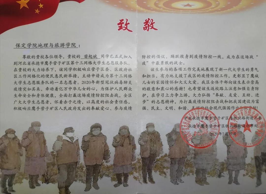 pp电子官方网站入口学生在疫情期间积极参与志愿服务,共计130人。近日,陆续收到了来自各地基层党组织及社区村镇寄来的表扬信。信中对pp电子官方网站入口学生们这段时间参加属地抗疫志愿服务提出了高度赞扬。这些来信不仅肯定了地旅学子积极投身抗“疫”志愿服务的热情,表扬了他们用实际行动共同抗击疫情的坚定决心,还表达了对pp电子官网学生的责任担当意识及奉献精神的高度认可。
