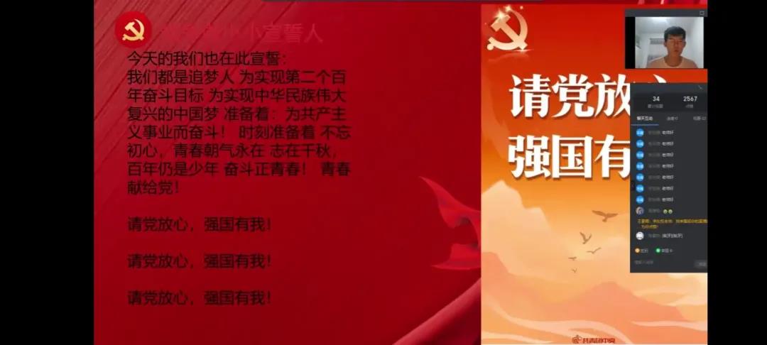 靡不有初,鲜克有终;不忘初心,方得始终。初心是在起点时心中的承诺与信念,是困境时应履行的责任与担当。最后,同学们郑重宣誓:“请党放心,强国有我。”100年前,中国共产党从嘉兴南湖上的一叶小舟起航,紧紧依靠和团结全国各族人民,一路高歌,披荆斩棘,中国共产党作为现实中华民族伟大复兴“中国梦”的领路人,是历史的选择,更是中国人民的选择。希望同学们以崇高的理想、创新的意识、无畏的勇气展现新时代少年的智慧、风采和力量,与时俱进、努力学习,争做优秀的共产主义接班人。