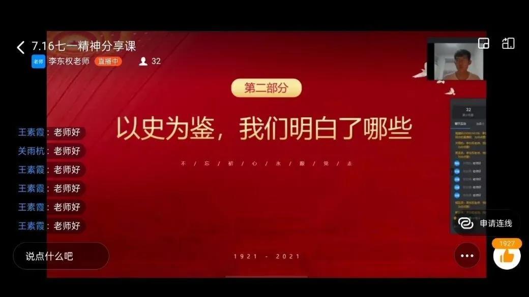 没有共产党就没有新中国。今年是中国共产党建党100周年,也是“十四五”规划的开局之年,我国将开启全面建设社会主义现代化国家的新征程、向第二个百年奋斗目标进军。成长在安逸富足生活中的我们,是否还能记得是谁打下的太平山,是谁经历了千辛万苦换来了今天的和和平与安逸。为了增强同学们的民族自豪感,花开远方暑期实践团队于2021年7月16日组织同学们学习了习近平总书记“七一”重要讲话精神。