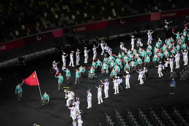 在开幕式运动员入场式中,身穿淡绿色西装礼服的中国代表团,在双旗手——女子轮椅射箭运动员周佳敏和男子肢障田径运动员王浩的引领下,按照日语首字母顺序,排在第88位入场。