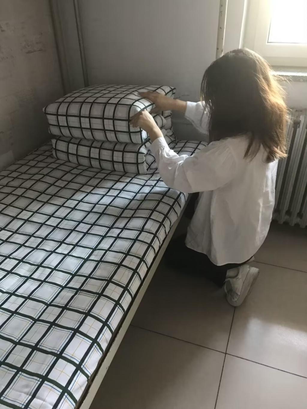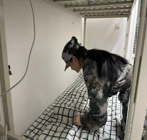 军训教官来到学生寝室,亲自示范如何叠被子、挂毛巾、摆放物品等操作,向学生讲述内务整理的技巧。对于军训标志性“豆腐块”被子的操作要领,同学们认真观察教官的示范动作,并反复练习。运用“压、折、挤、掏”等基本动作完成从棉被到“豆腐块”的进步。接着教官对卫生区洗漱用品的摆放提出整改要求,同学们积极配合重新布置。