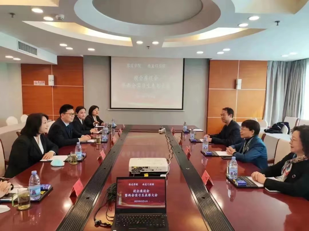 友谊宾馆党委书记、总经理龙洁、副总经理张涛、人力资源总监祖光旗,西直门宾馆总经理王迎霞、副总经理王悦雷、刘旸,中国妇女活动中心好苑建国酒店党委书记宋胜菊、总经理李岿、副总经理王建军,服务全国“两会”的学生代表及在酒店就职的校友代表参加了座谈会。