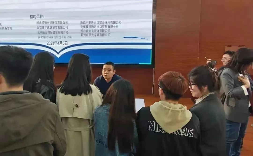为切实推进2023届毕业生就业工作,做好用人单位和毕业生的对接服务,4月6日,我校邀请河北爱德会展服务有限公司、北京嘉宇沃德展览有限公司、北京融合国际展览有限公司、海森华宠进出口贸易涿州有限公司、河北鲁迪戈服饰有限公司等多家主营会展、外贸业务的省内外知名企业来校召开就业洽谈暨专场招聘会。