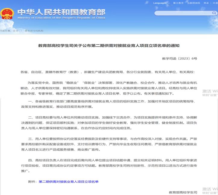 供需对接就业育人项目由教育部设立,面向全国高校开放申请,2021年首次实施。旨在推动就业与培养有机联动、人才供需有效对接,帮助用人单位培养和招聘更多实用型、复合型和紧缺型人才,促进高校毕业生更加充分更高质量就业。经高校申请、用人单位申报、专家审核、立项单位信息核查,确定供需对接就业育人项目名单。