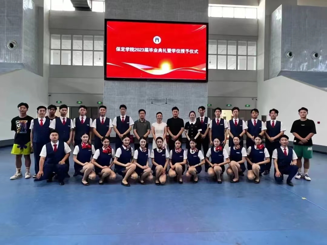 在学位授予仪式上,毕业生们走上主席台,校领导和学位评定委员会委员为他们一一拨正流苏,颁发毕业证书,合影留念。保定学院航空专业选派10名女生和15名男生作为毕业典礼学位授予仪式的礼仪保障人员,协助领导及委员为优秀毕业生代表和西部就业毕业生颁发荣誉证书。