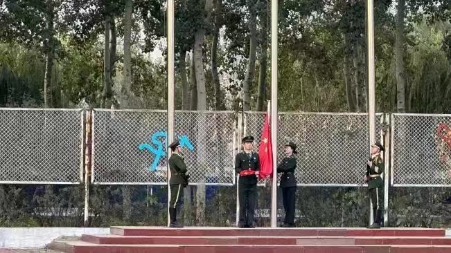 向着初升的朝阳,国旗护卫队昂首挺胸,整齐的步伐走向升旗台。国歌奏响,五星红旗冉冉升起。全体师生队列整齐,以庄严的姿态表达心中对祖国的热爱与敬重之情。