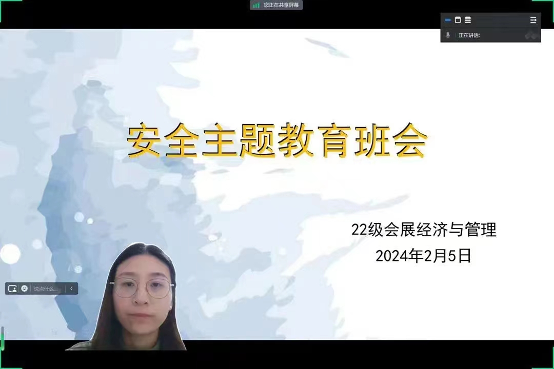 22级会展经济与管理专业一班全体同学,由辅导员主持并开展了寒假安全教育主题班会,本次班会采取线上腾讯会议的形式,围绕交通安全、防溺水、防火、防电安全、饮食安全等内容,为同学们进行了安全防范知识培训,引导同学们在寒假期间提高自我保护意识和防范能力。