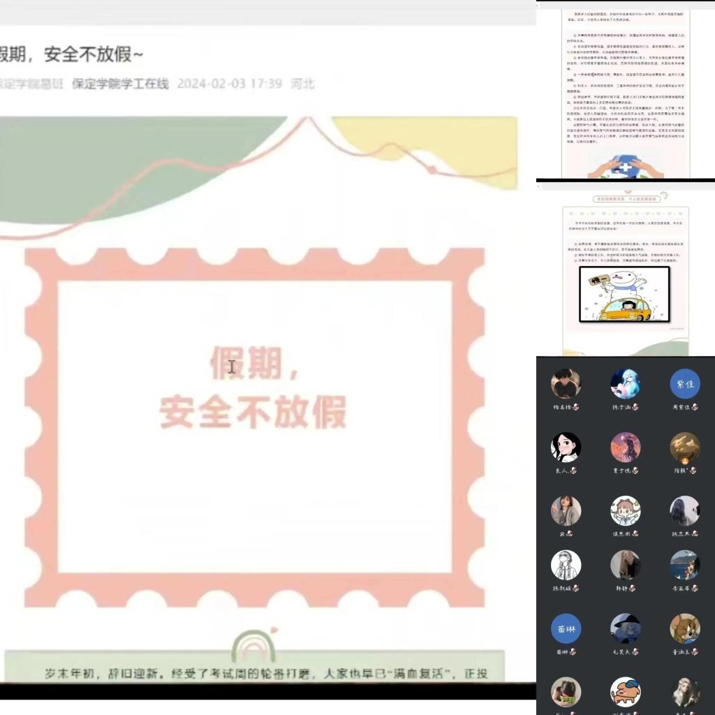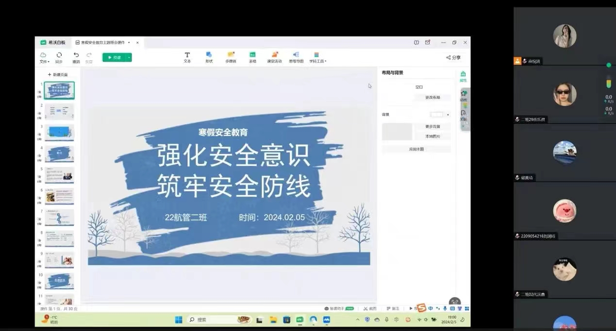 2024年2月5日晚19:00,保定学院pp电子官方网站入口22级航空服务艺术与管理四班在线上开展了寒假安全教育活动,主要围绕出行安全、消防安全、饮食安全、网络通信、自我保护、文明过节等内容为同学们进行了安全防范知识培训,引导同学们在寒假过年期间提高自我保护意识和防范能力。