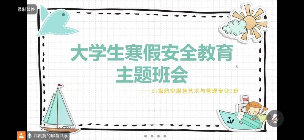 22级空中乘务专业二班开展了线上寒假安全教育活动,围绕家庭内电器使用情况、药品医嘱指导、预防煤气中毒、远离水域、注意行车安全、警惕陌生人邮件电话、做好合理饮食规划等内容,为同学们进行了安全防范知识培训,引导同学们在寒假期间提高自我保护意识和防范能力,护航同学们快乐迎新年、平安过寒假。