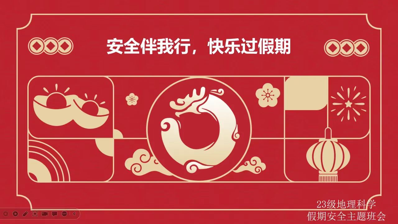 23级地理科学专业开展了寒假安全教育主题班会,围绕出行安全、居家安全、娱乐安全、饮食健康安全等内容。让同学们能够充分认识到寒假期间的安全问题,并掌握相应的应对策略,引导同学们在寒假期间提高自我保护意识和防范能力,确保同学们能够度过一个平安、快乐的寒假。
