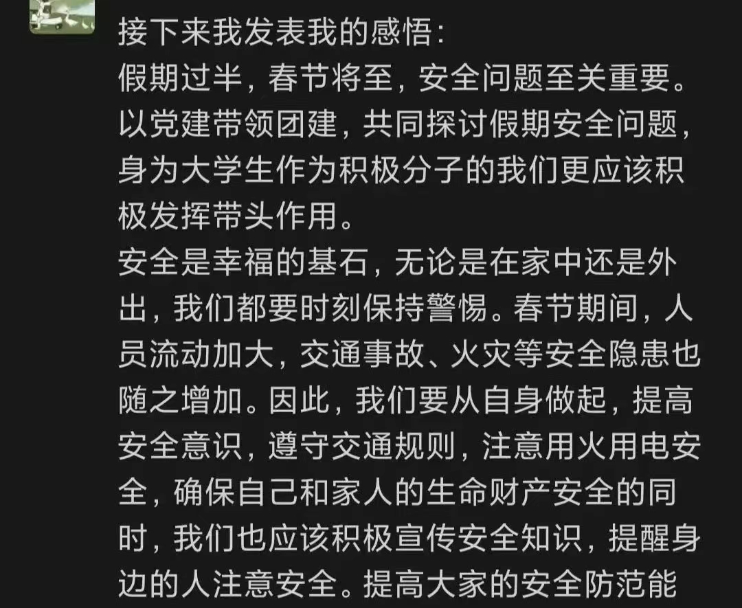 2023级人文地理与城乡规划专业开展了一次意义非凡的寒假安全教育活动。活动的核心内容是观看并学习《假期,安全不放假》这篇文章,它不仅是一份安全提醒,更是一份关乎每位同学福祉的关怀。活动中,同学们都积极参与,用认真的态度对待每一个安全知识点,共同为春节假期筑起了一道坚固的安全防线。通过观看,学习到如何在家庭中、在街道间、在网络上、在实践时提高安全系数,如何提高身体健康指数,共同奔赴欢乐和温馨的春节,共同收获丰富多彩的欢乐假期。