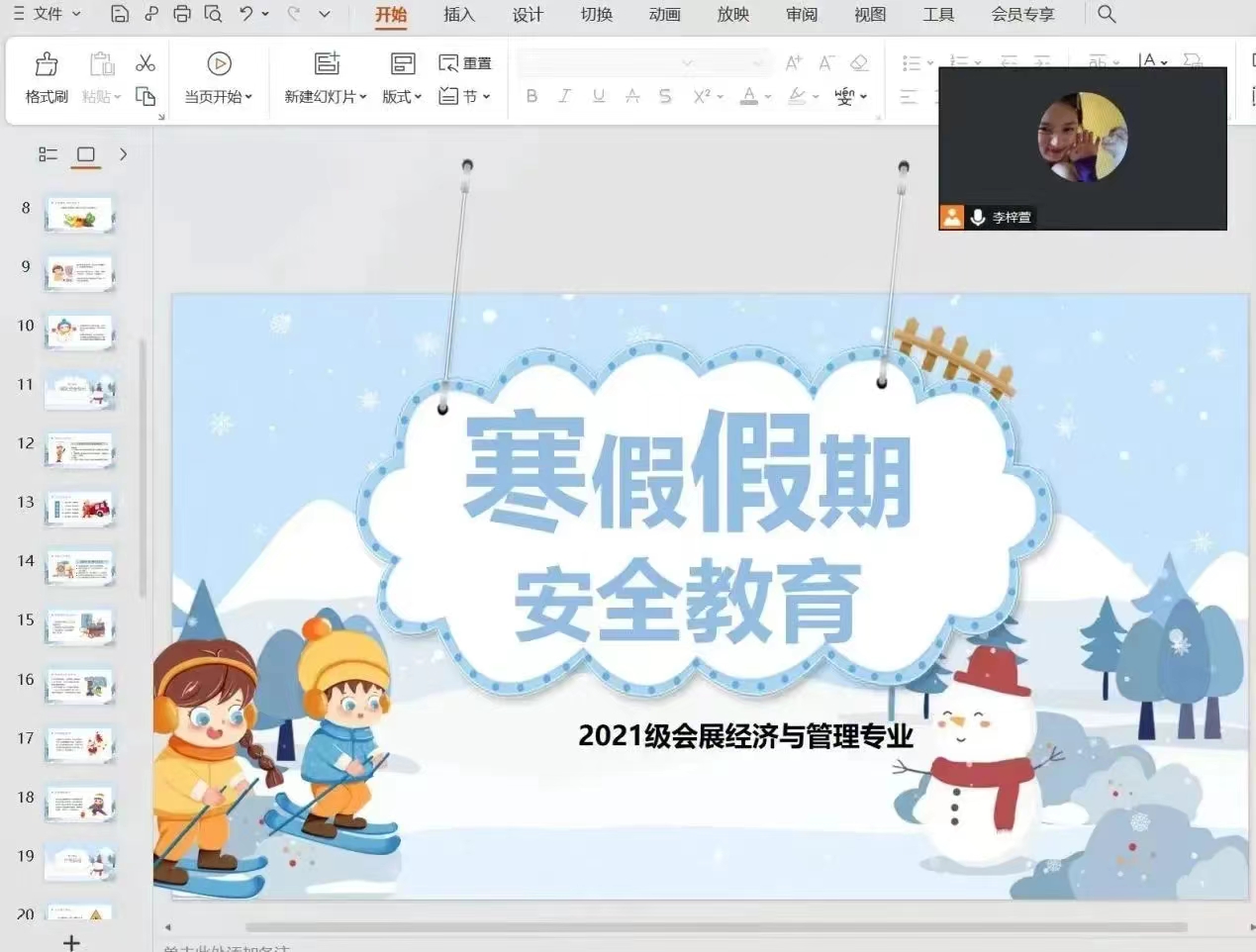 21级旅游管理与服务教育专业全体成员通过腾讯会议在线上开展了寒假安全教育活动,辅导员老师围绕交通安全、防溺水、防火、防电安全、饮食安全等内容,为同学们进行了安全防范知识讲解,引导同学们在寒假期间提高自我保护意识和防范能力,快乐迎新年、平安过寒假。