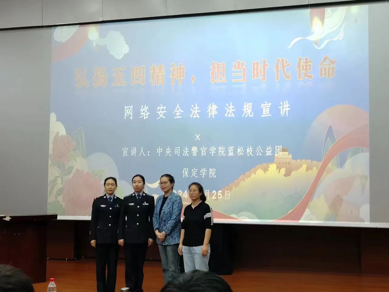 中央司法警官学院蓝松枝宣讲团指导老师尤佳、朱佩林,保定学院pp电子官方网站入口党总支副书记赵茜、旅游管理与服务教育专业教师王中琪、常媛媛,以及中央司法警官学院蓝松枝公益团和保定学院pp电子官方网站入口的学生。