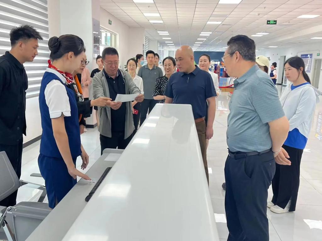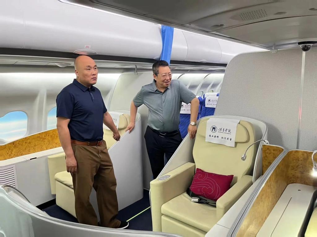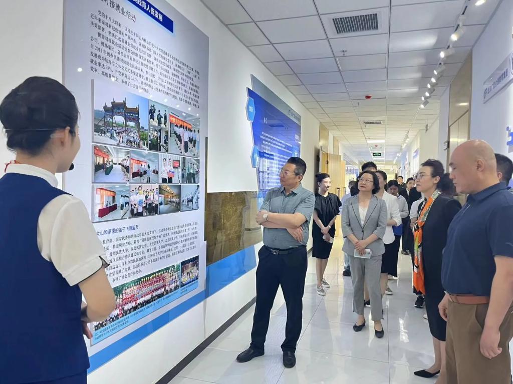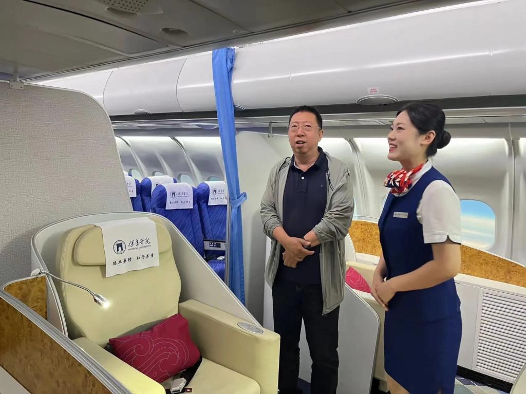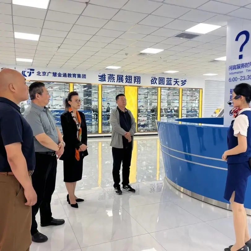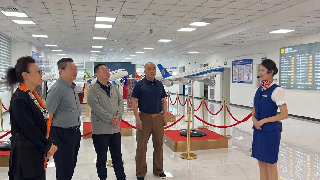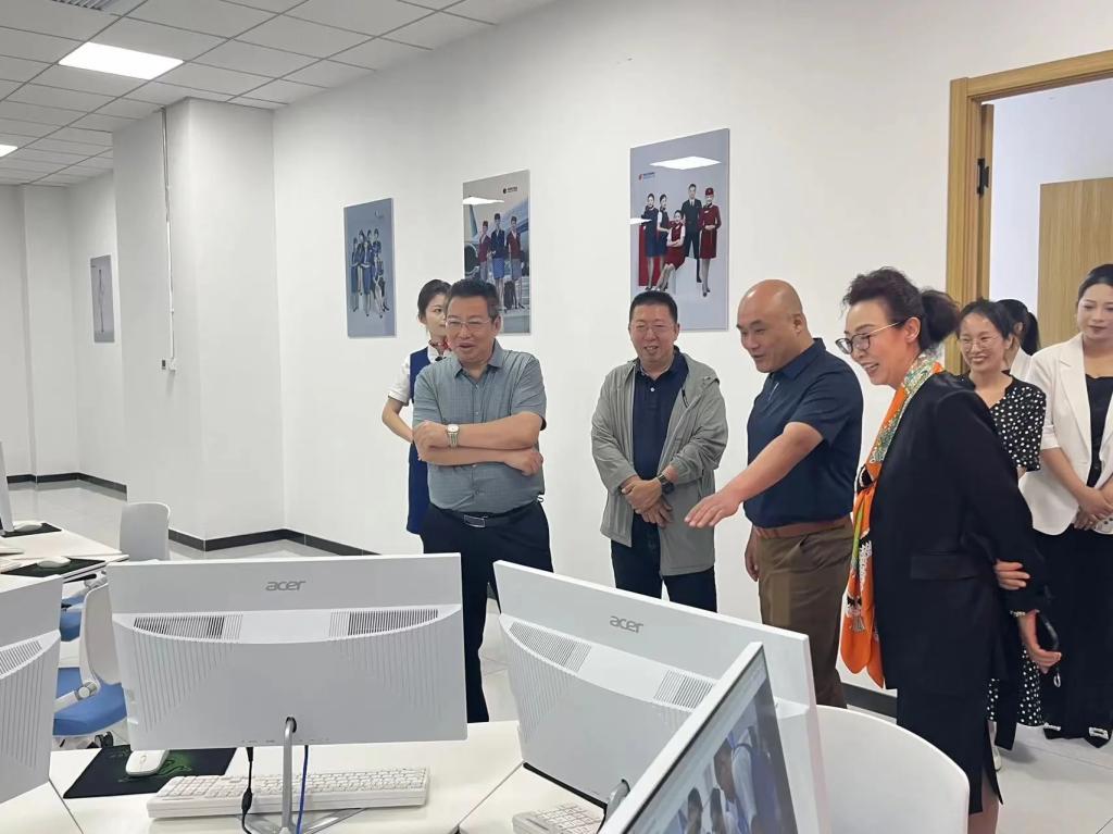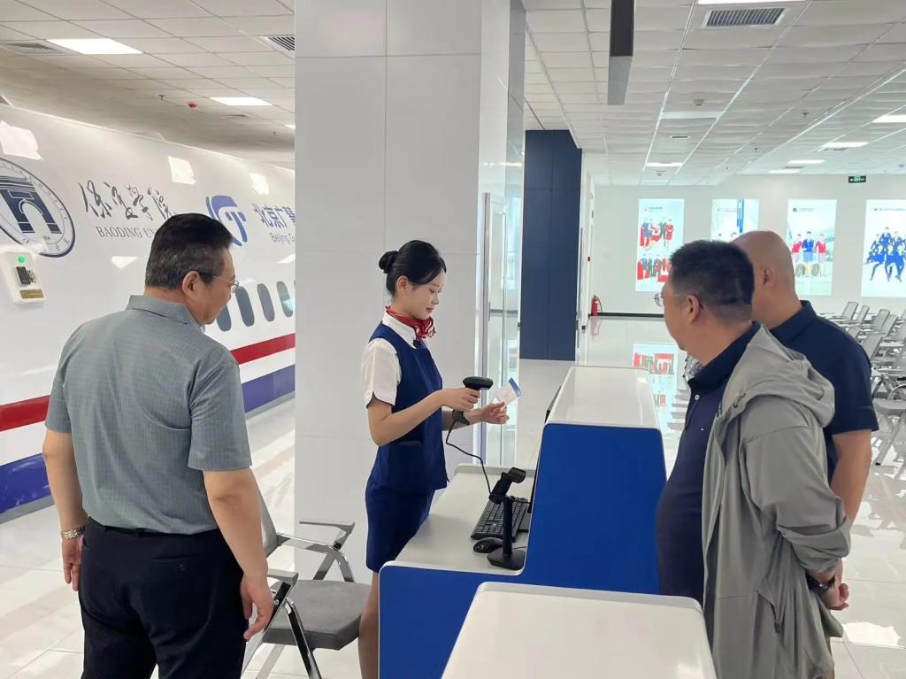 在参观过程中,航空专业讲解团的讲解员们带领各位领导参观了实训中心问询处、值机办理处、安检处以及登机处等一整条完整的地服生态链,沉浸式体验了航空模拟舱,一同感受了客舱内的真实环境。