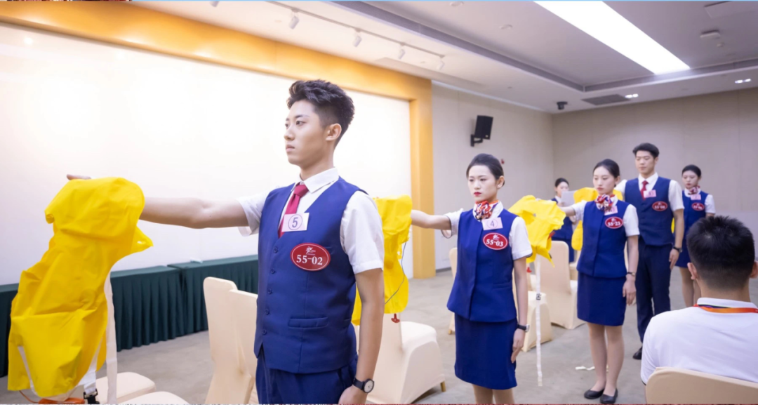 本环节,各院校参赛选手以6人为一乘务组进行考核,在规定时间内完成“有准备陆地/水上撤离”的考核内容。重点考察选手对于紧急设备的位置、用途使用方法、注意事项、出口位置、撤离路线的划分是否熟练掌握,以及面对考官临时提问的应变能力。技能比赛现场,我校参赛队选手们镇定自若地完成着每项操作,坚定沉稳的指令声不断回响,最终在乘务组的默契配合与快速应对中,迅速完成撤离,保证了乘客安全。生动形象地展示了日常教学中对于实操技能的重视和训练成果。