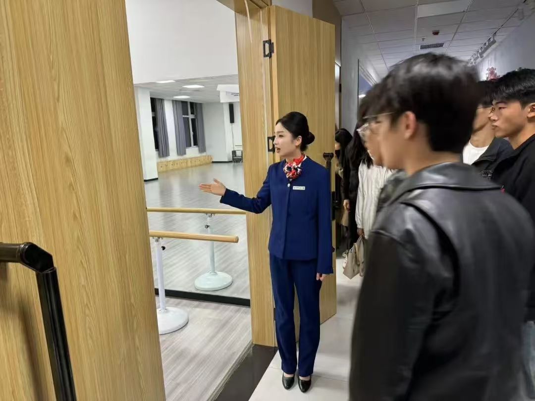 在讲解员的带领下,新生步入宽敞而明亮的形体房,室内的灯光如星辰般洒落,引发了同学们感慨万千。他们既对即将展开的课程生活怀揣无限憧憬,心中又暗暗种下决心的种子,誓要在这个舞台上以不懈的努力追寻属于自己的璀璨梦想。