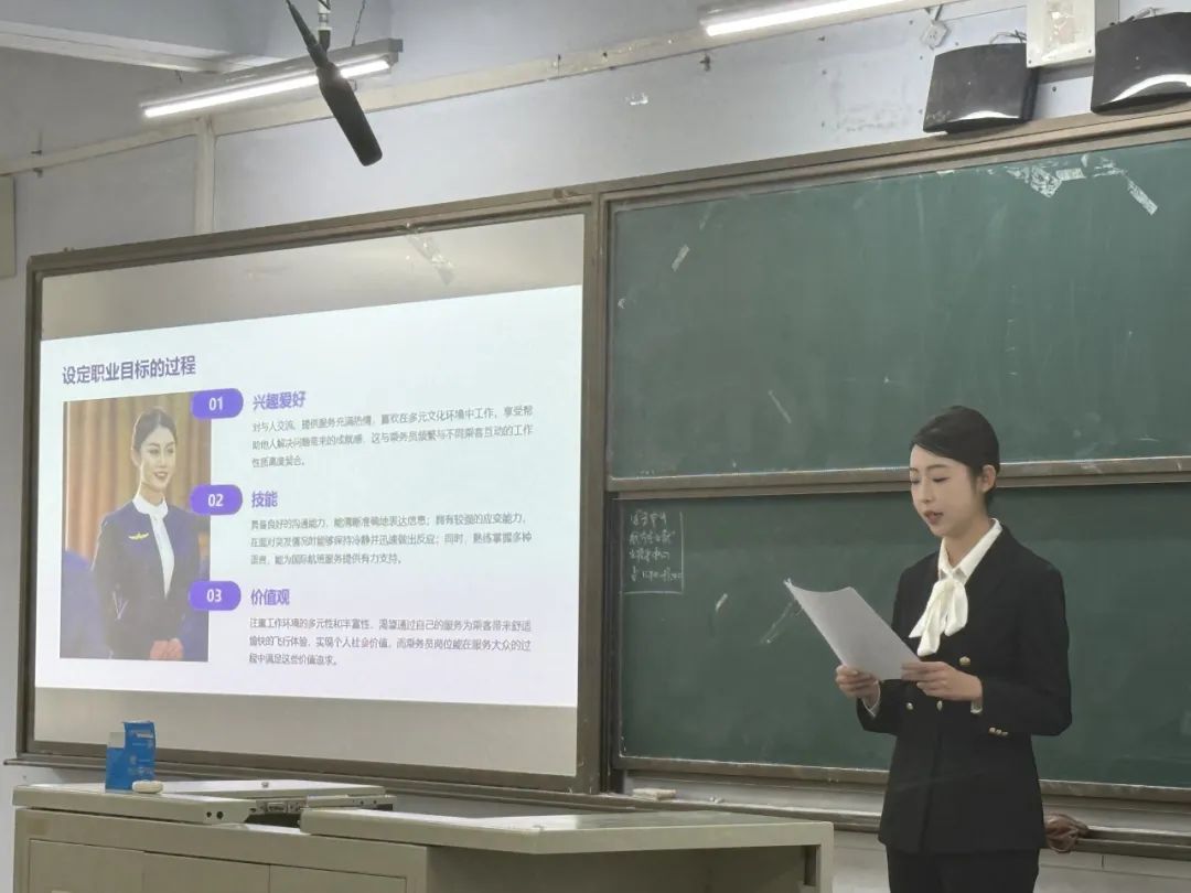 2022级航空服务艺术与管理专业乔琪,通过讲述自己去年参赛的经历为同学们提供了宝贵的经验,进行了参赛经验分享。参加职业规划大赛让她更加深入地思考了自己的兴趣、优势和未来想要从事的职业。学姐表示此次参赛让她受益匪浅,同时鼓励同学们大胆畅想、认真准备自己未来的成长路线以及职业发展。