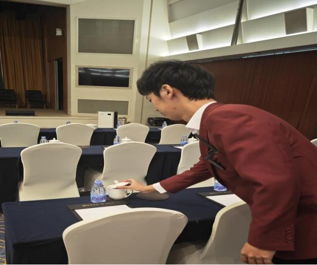 (图为餐饮部李寒雪在好苑建国酒店整理餐具照片)