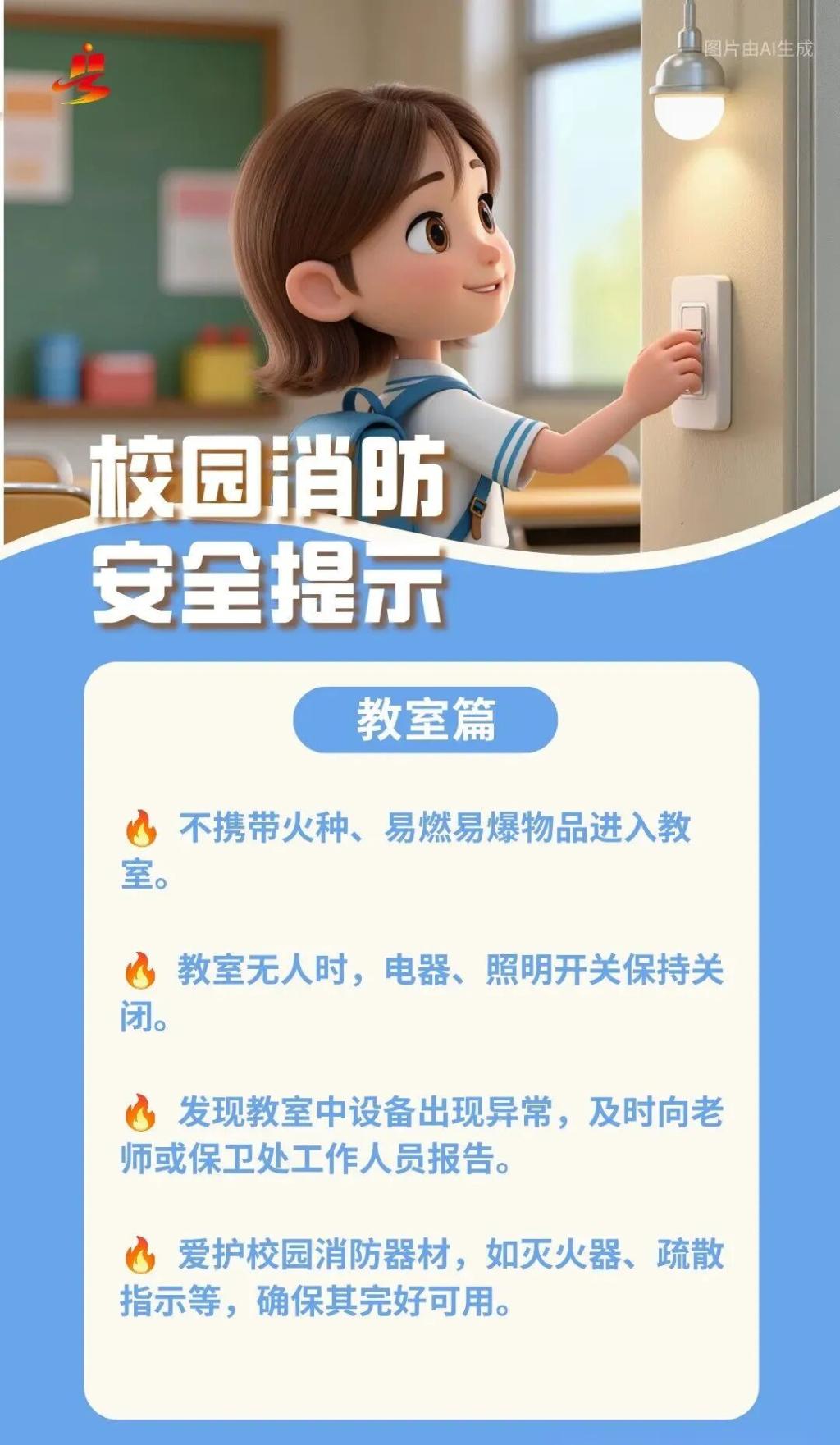 学校人员密集,安全隐患较多,一旦引发火灾,或将造成严重后果,校园消防安全不容忽视,让我们共同学习防火知识,提高安全意识,从点滴做起,从身边做起,防患于未“燃”,用实际行动守护校园平安,共绘校园安全新底色。
