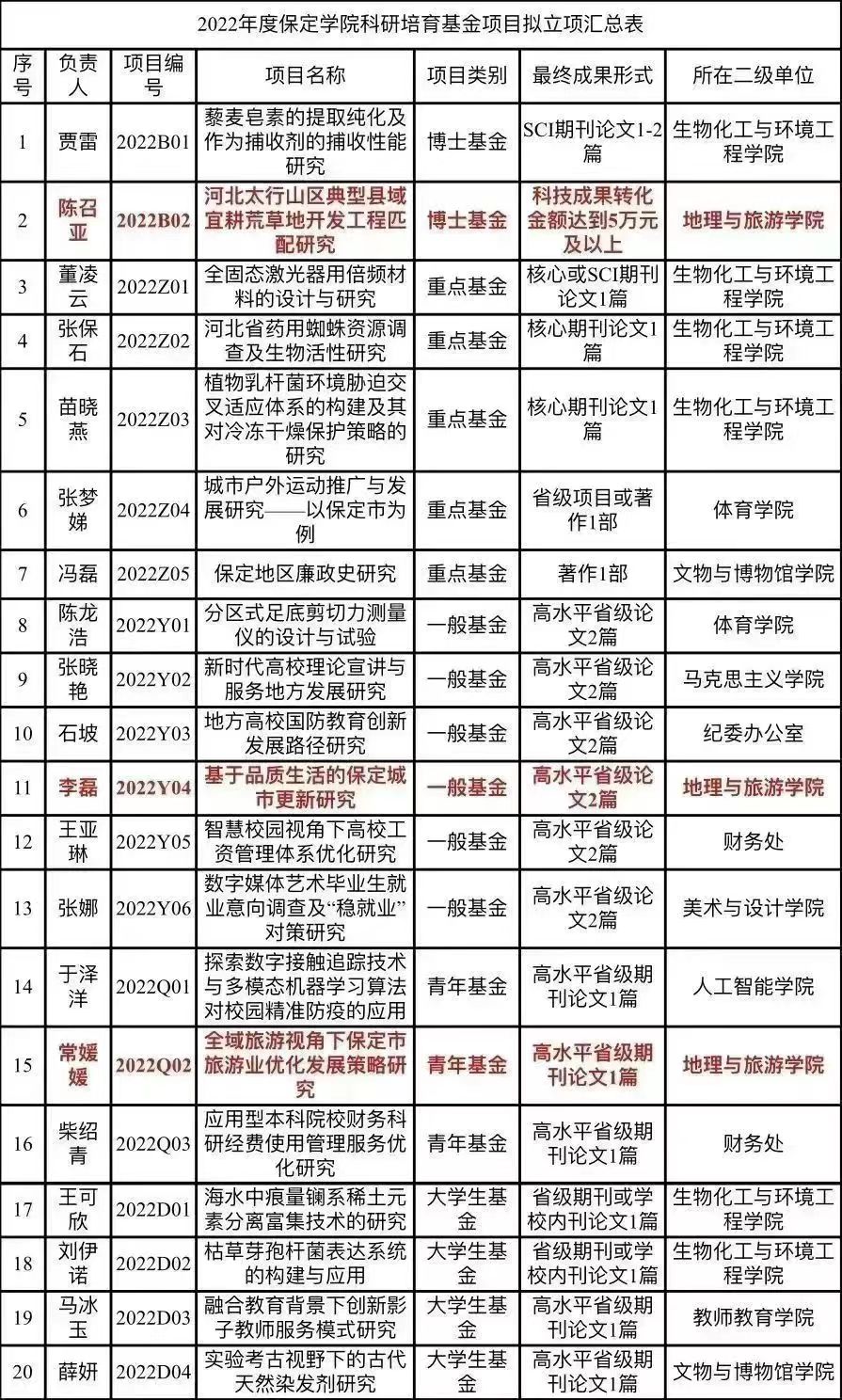 近日,科研处公示了2022年度保定学院科研培育基金项目拟立项名单,pp电子官网三位老师的项目位列其中。其中,陈召亚老师的《河北太行山区典型县域宜耕荒草地开发工程匹配研究》立项为博士基金,资助金额5万元;李磊老师的《基于品质生活的保定城市更新研究》立项为一般基金,资助金额3000元;常媛媛老师的《全域旅游视角下保定市旅游业优化发展策略研究》立项为青年基金,资助金额2000元。科研处发布的拟立项名单如下: