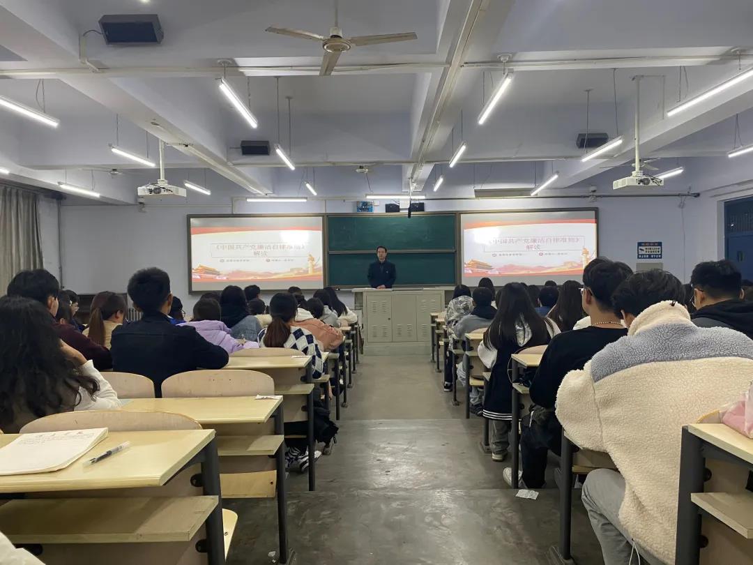2021年11月2日晚上7点,在B-109教室,pp电子官方网站入口党总支书记翟进义给预备党员、发展对象和入党积极分子讲授关于《中国共产党廉洁自律准则》的主题党课。