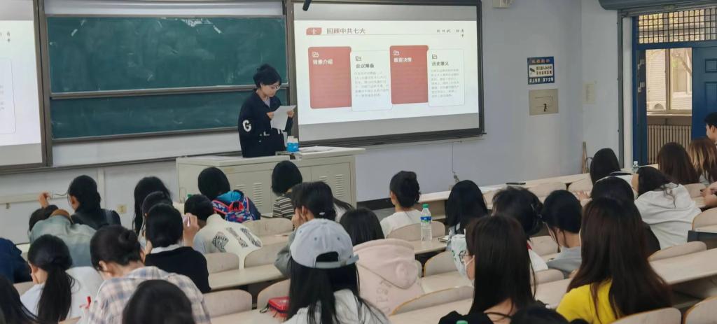 团课伊始,主讲人以一段珍贵的历史影像资料,将同学们带回到那个战火纷飞却又激情燃烧的年代。1945 年,在抗日战争即将取得全面胜利的历史关头,党的七大在延安杨家岭中央大礼堂隆重召开。主讲人结合详实的历史文献和生动的历史故事,深入剖析了七大召开的时代背景、历史意义和重大决策。