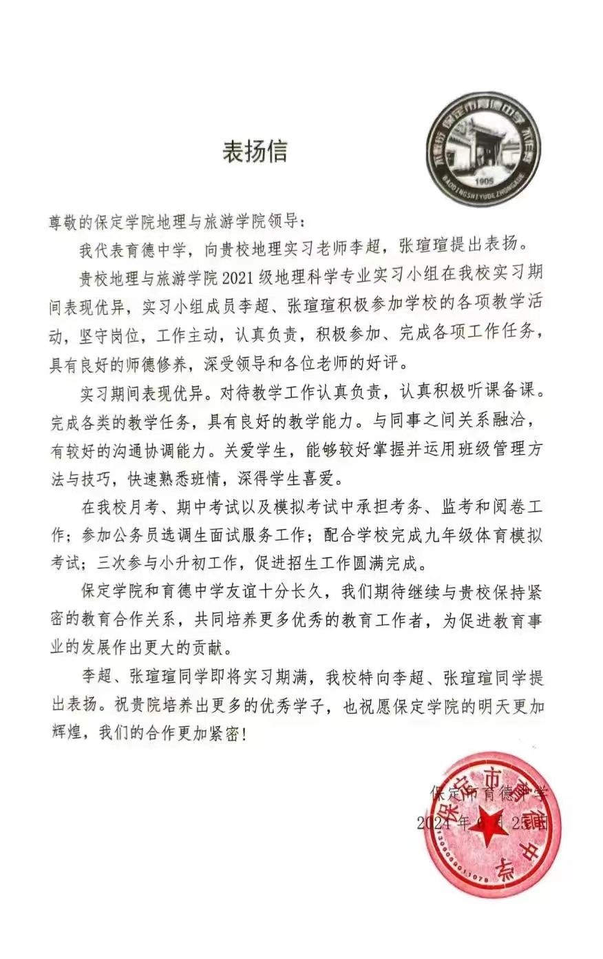 近日,pp电子官网接到育德中学的一封表扬信,对地理科学专业的实习生李超和张瑄瑄同学给予表扬。两位同学在实习期间积极参加育德中学的各项教学活动,坚守岗位,工作主动,认真负责,积极参加、完成各项工作任务。他们在师德修养、敬业精神、专业水准、班级管理、沟通能力等方面的优秀表现,不仅赢得了实习学校师生的一致好评,也为pp电子官网争得了荣誉。pp电子官网将进一步加强师范生培养力度,不断提升师范生的专业素养和教育实践能力,培养出更多符合时代需求和教育发展的教育人才,为地方教育发展做出更大贡献。
