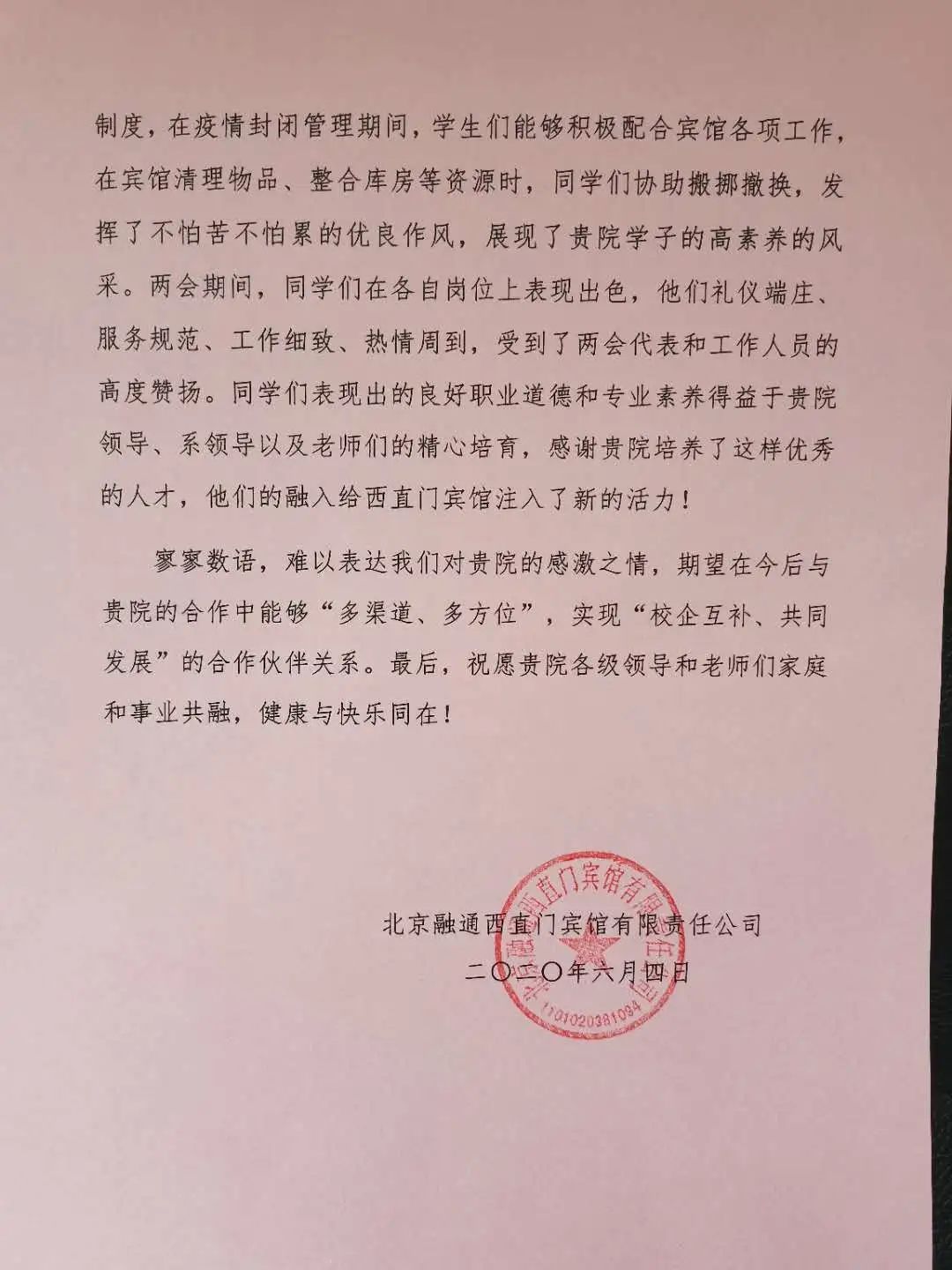 贵院解静怡、王桂润、赵钰、薛梦坤、刘洋、何玉洁、沈星、王兆敏、李立峰、冯嘉成、王伟、赵天赐、王逸飞、刘韵超、杨飞霄、迟灵凤、兰思净、孟瑶、姚嘉麒、朱月萍、冯思璇、吕星周、葛世豪、马健雄、王明华、王晓壮、陈辰、徐博研、宋鹏慧、柴文英、王佳微共31名学生,他们虚心好学,刻苦钻研业务知识,认真领悟所学内容,分到岗位后,严格执行宾馆的各项规章制度,在疫情封闭管理期间,学生们能够积极配合宾馆各项工作,在宾馆清理物品、整合库房等资源时,同学们协助搬挪撤换,发挥了不怕苦不怕累的优良作风,展现了贵院学子的高素养的风采。两会期间,同学们在各自岗位上表现出色,他们礼仪端庄、服务规范、工作细致、热情周到,受到了两会代表和工作人员的高度赞扬。同学们表现出的良好职业道德和专业素养得益于贵院领导、系领导以及老师们的精心培育,感谢贵院培养了这样优秀的人才,他们的融入给西直门宾馆注入了新的活力!