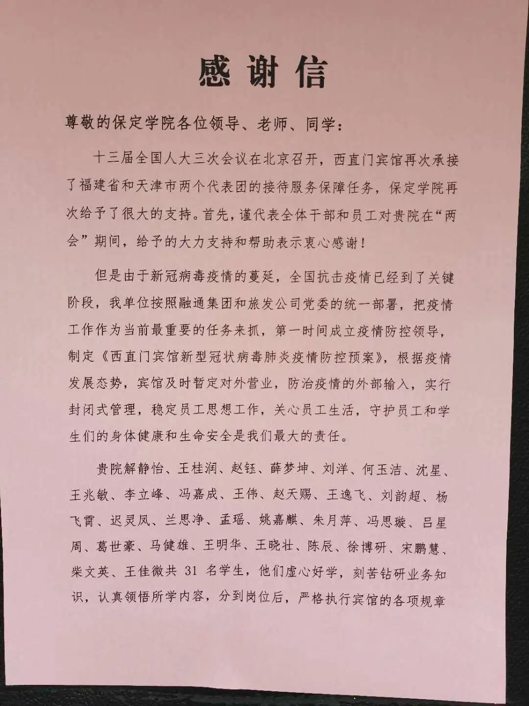 十三届全国人大三次会议在北京召开,西直门宾馆再次承接了福建省和天津市两个代表团的接待服务保障任务,保定学院再次给予了很大的支持。首先,谨代表全体干部和员工对贵院在“两会”期间,给予的大力支持和帮助表示衷心感谢!