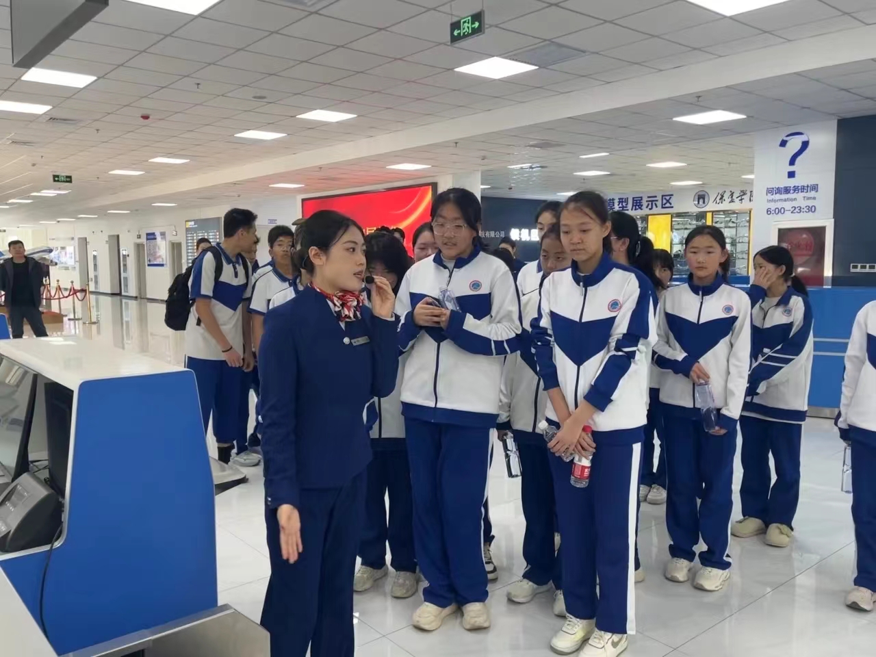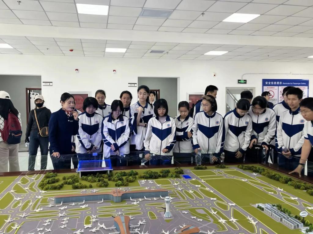 讲解员们带领每一位同学参观售票处、值机柜台、安检处、登机处、问询台以及模拟舱等区域,让他们体验到登机的全部过程。同时,一楼大厅摆放的各个航空公司的制服、飞机模型以及北京大兴国际机场沙盘,吸引了每一位同学前来参观,也让他们深深地感受到了航空专业的独特魅力。