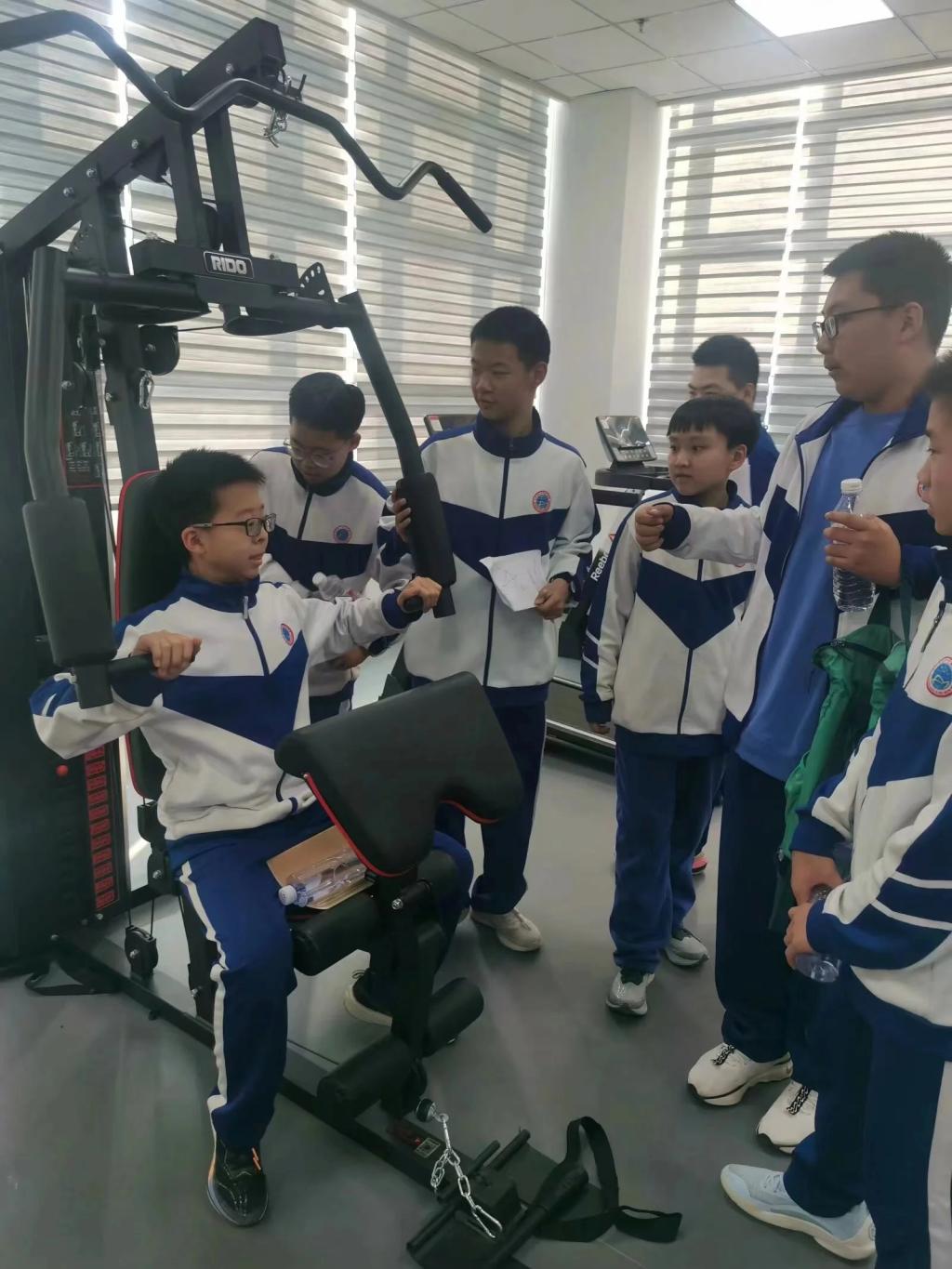 在结束一楼的参观后同学们迈着整齐的步伐通过明亮的楼梯便到达了二楼,走廊里文化墙上丰富的内容使得他们纷纷驻足围观,健身房、形体室、实训室、化妆室、会议室以及CBT实训室等各个功能设施完备的教室给他们留下了深刻的印象。