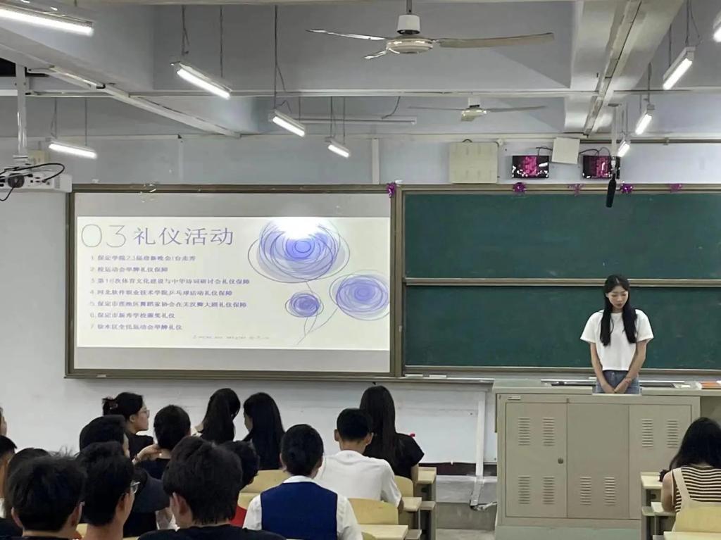 礼模队队长赵俊莹代表礼模队进行总结。在这一年里,礼模队作为展现专业形象与风采的重要力量,积极参与了众多校内校外的各项活动共计26余次,例如:校迎新晚会、“两会”表彰礼仪、徐水区服务保障工作、回信精神十周年礼仪、学院送老晚会等,我们坚持定期开展基础礼仪的训练课程,通过严格的的训练不断提升队员们的礼仪素质及团队协作能力,为了每一次在活动中的完美呈现而共同努力。这一年是礼模队充实而富有成果的一年,我们将继续努力,创造更加辉煌的明天。
