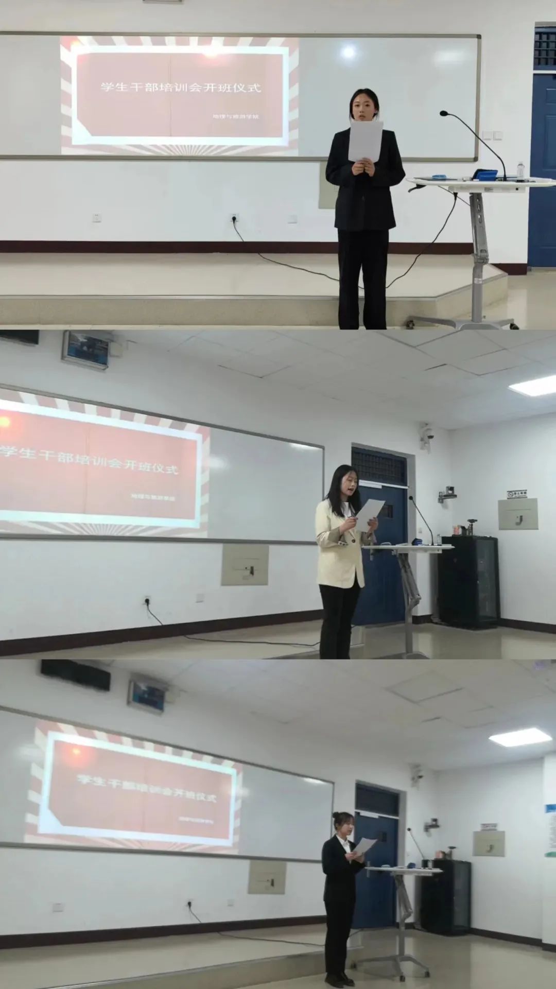 5月6日晚上7点学生干部培训会开班仪式在E3-108召开,团总支副书记陈美伊、耿奥和学生会主席孟凡面向20级和21级的学生干部开展了培训。